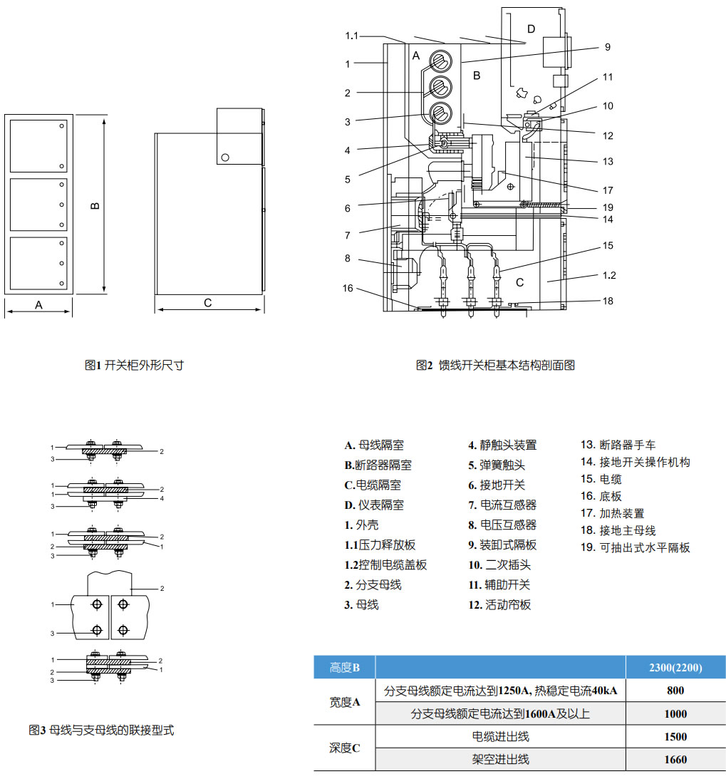 在電纜室內(nèi)單獨設(shè)立有5X40mm2的接地銅排能貫鄰相鄰的開關(guān)柜,并與柜體良好接觸。此接地排供直接接地之元器件使用。同時由于整個柜體用覆鋁鋅板相拼聯(lián),這樣使整個柜體都處在良好接地狀態(tài)之中,確保運行操作人員觸及柜體**。開關(guān)設(shè)備外形尺寸(見圖1)