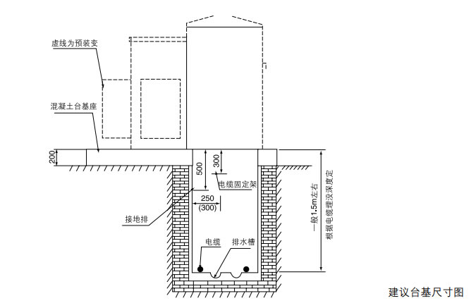 組合式變電站安裝在水平混凝土臺面上,臺面應保證承受其重量.建議臺基尺寸 ( 見下圖 )