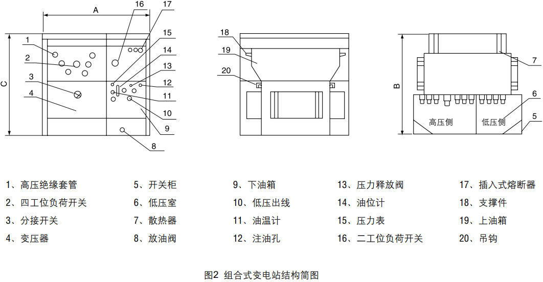 產(chǎn)品結(jié)構特點(原理圖見圖1、結(jié)構圖見圖2) 變壓器器身與高壓開關設備分油箱裝配,兩者僅電氣連接而油相互隔離。帶電操作負荷開關產(chǎn)生的電弧只能使負荷開關油箱中的油變黑甚碳化而不影響變壓器中油的質(zhì)量。損耗小、過載能力強??捎糜诃h(huán)網(wǎng)供電、雙電源供電或終端供電系統(tǒng)中,供電方式轉(zhuǎn)換方便、運行可靠。 本產(chǎn)品具有缺相保護裝置,當缺相時,可自動同時斷開變壓器的進線負荷開關和低壓側(cè)斷路器(總開關),也可只斷開高壓側(cè)負荷開關或低壓側(cè)斷路器。 |